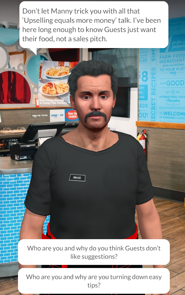 Upselling metrics were trending downward across dozens of restaurant locations for a major national restaurant brand. Gap analysis and interviews with staff made it clear that the issue wasn’t training but employee motivation. The course provides learners a means to acquire desirable upselling behaviors through branching scenarios, realistic dialogue, and persona aligned guest interactions.